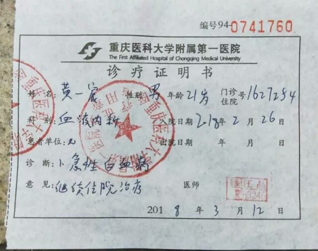 他叫黄一宸,男,现年21岁,就读于PA视讯官网。今年2月26日,连续发烧一个多月的黄一宸在重庆医科大学第一附属医院确诊患上急性髓系白血病(AML),俗称血癌!目前,黄一宸每天以化疗维持生命,且需要骨髓移植。那也就意味着这是一笔相当昂贵的医疗费用。母亲下岗,父亲工资微薄,家里唯一一套住房为非商业住房,仅能转让居住权。亲戚朋友家也已借遍,高昂的医药费对于这个本就不富裕的工薪家庭家庭已无力承担。