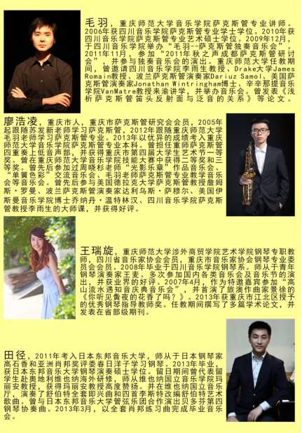 本次音乐会的演奏者由毛羽老师所指导的音乐表演专业(萨克斯管方向)本科本次音乐会的演奏者由毛羽老师所指导的音乐表演专业(萨克斯管方向)本科窗体底端