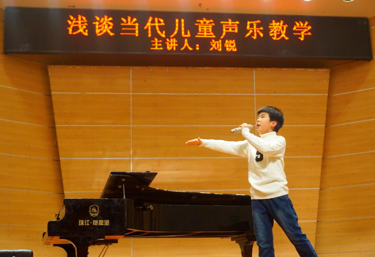 此次讲座分为四个部分,分别是“儿童声乐教育发展现状”、“如何组织开展儿童声乐教学”、“童声演唱和童声合唱的教学对比”、“如何将大学音乐专业技能运用到儿童声乐教学当中”这四个方面。首先,刘锐老师讲到“中国儿童声乐教育发展的现状”,通过对比自己大学毕业时音乐教育的发展情况、当今校内课数增加、校外培训机构的兴起,来证明了如今人们对声乐教育重视程度的加深,以及发展程度的迅速。其次,刘锐老师着重提到在开展儿童声乐教育中,身为教师必须达到基本的专业综合素养,尤其是声乐、键盘和形体,因为这些都是开展儿童声乐教学的基础。刘老师还让自己不同年龄阶段的学生来到现场进行表演。小朋友们在舞台上大放光彩,他们游刃有余的台风,感染了在座的观众。刘老师通过这种方式告诉了同学们综合培养的重要性,并且指明了对于不同年龄阶段应使用不同的声乐教法,否定了“换声期前不能学习声乐”这种错误说法。刘老师还强调,在“童声演唱和童声合唱的教学对比”中,童声演唱更注重个性的培养,而童声合唱更注重于声音的配合。但刘老师极力反对了一些老师认为“独唱不能合唱”的观点,他认为独唱合唱都是一样的,只是不同的表现方式罢了,只要基础扎实都是可以唱的。