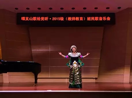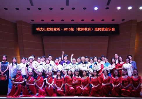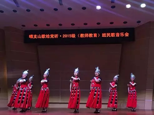最后,2015级教师教育班全体同学为大家带来了一首耳熟能详的石柱民歌《太阳出来喜洋洋》,李晶老师为钢琴伴奏。《太阳出来喜洋洋》是与民歌《黄杨扁担》做了融合改编而成新曲,给观众一种耳目一新的感觉,赢得阵阵掌声。晚会在《唱支山歌给党听》的优美旋律中顺利结束了。