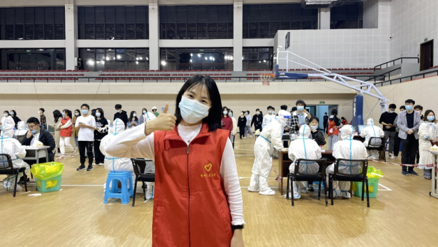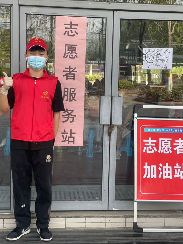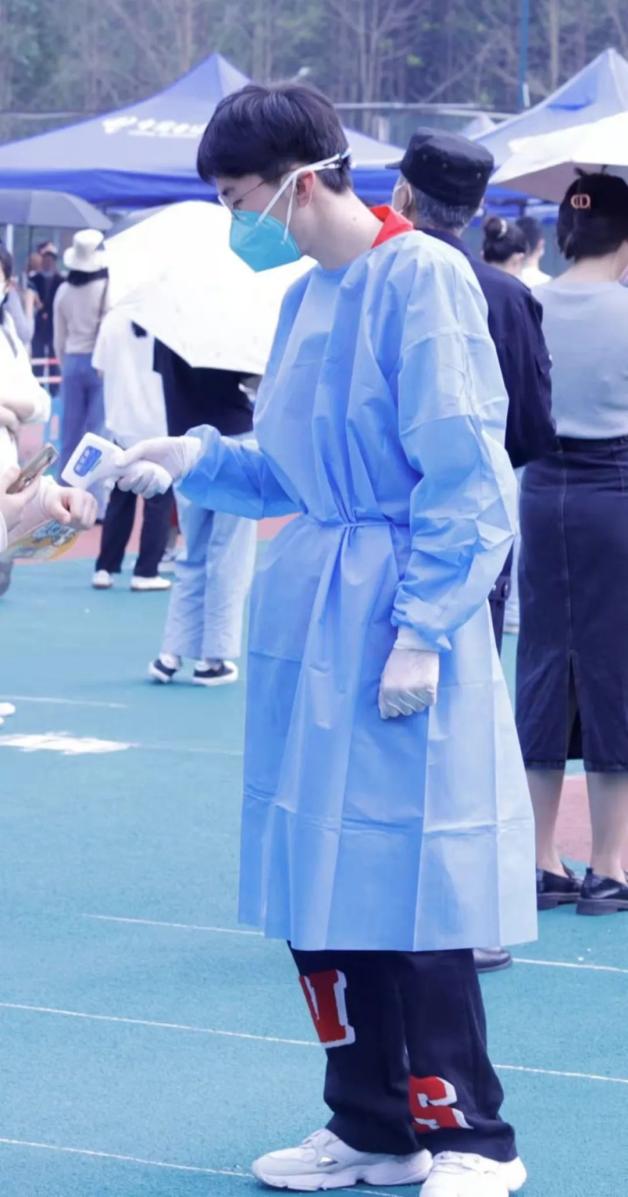 疫情突如其来,打乱了我们的学习生活,当我得知需要志愿者消息时,毫不犹豫地报名加入,希望能做一些力所能及的事情。起初是在志愿者服务站值班,在做第二次核酸和第三次核酸时,我便被安排在了测量体温的岗位上,穿上防护服后感受到的不仅是闷热,更是一份沉甸甸的责任。在疫情防控的关键时刻,认真踏实地做好我所负责的工作。在场上不仅做好测温工作,也为同学们做好服务工作,同学们不绝于耳的“谢谢”声使我倍感值得。在骄阳直射的“烤“验下,三个小时的站岗,衣服已被汗浸湿,橡胶手套里亦是积满汗水。
