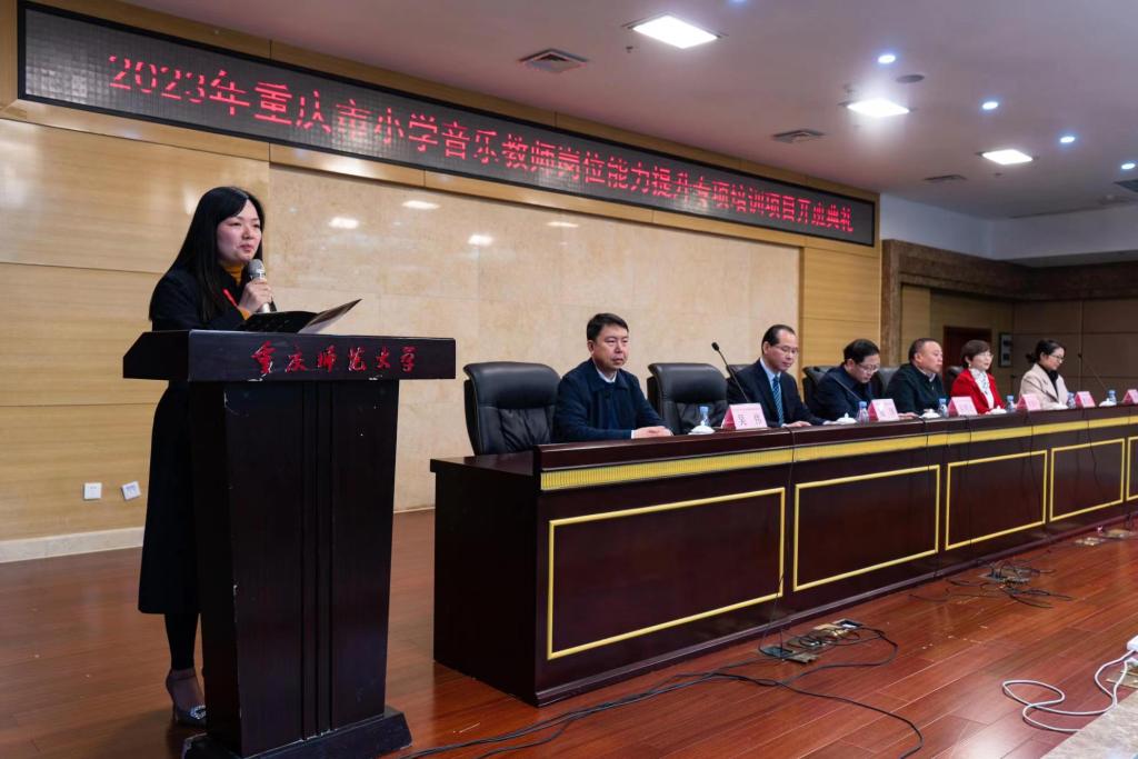2023年3月21日,“2023年重庆市小学音乐教师岗位能力提升培训”开班典礼在重庆师范大学博雅楼504会议厅隆重举行。重庆市教委体卫艺处处长程翔宇、重庆师范大学继续教育学院党委书记侯明志、PA视讯官网党委书记曾凡浏、副院长(主持工作)郑华、党委副书记宋雪飞、副院长吴伟等领导出席了开班典礼。开班典礼由音乐学院副院长郑华主持。