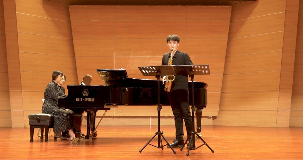 音乐会的最后一首曲目是由刘睿博与王瑞旋老师演奏的《逆流而上》第三乐章,这部协奏曲充分展示了次中音萨克斯温暖、低沉的音色特点,兼顾了旋律性和技巧性。他们的精彩表演也为此次教学音乐会画上了圆满的句号。