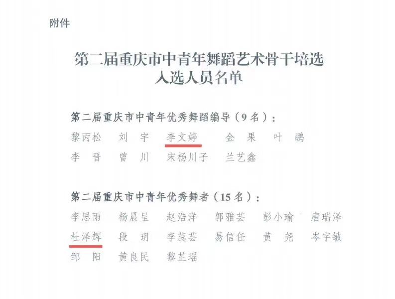 重庆市中青年舞蹈艺术骨干培选工作每三年一届,旨在为持续推动我市舞蹈创作,培养舞蹈人才,鼓励优秀编创、表演人才的创作及表演热情,更好地促进我市舞蹈艺术繁荣发展。重庆市文联于2023年10月开展了第二届重庆市中青年舞蹈艺术骨干培选工作,经专家评审组严格把关,综合各方反馈意见,经市文联党组会议审定,评选出中青年优秀舞蹈编导9名,中青年优秀舞者15名。