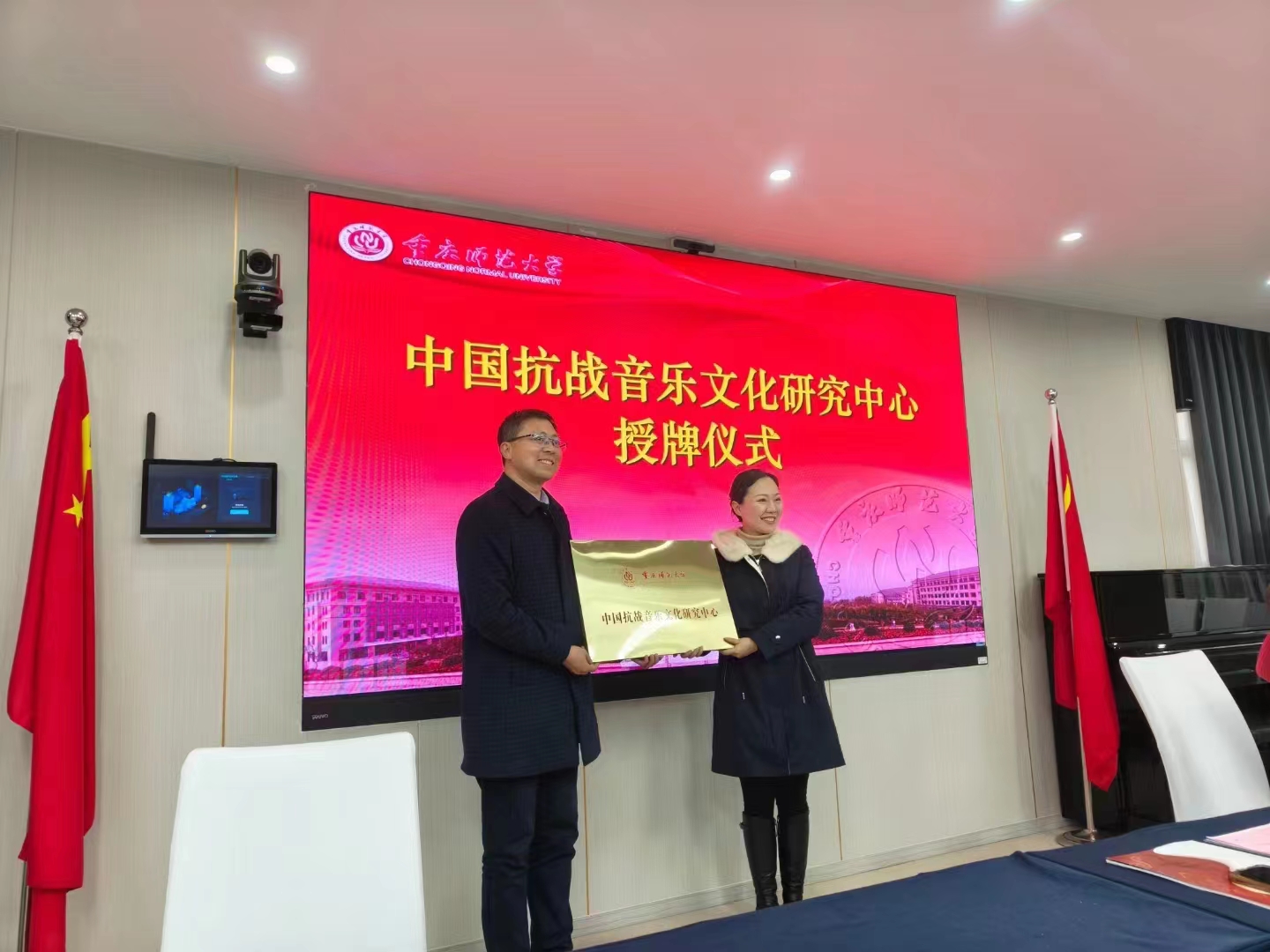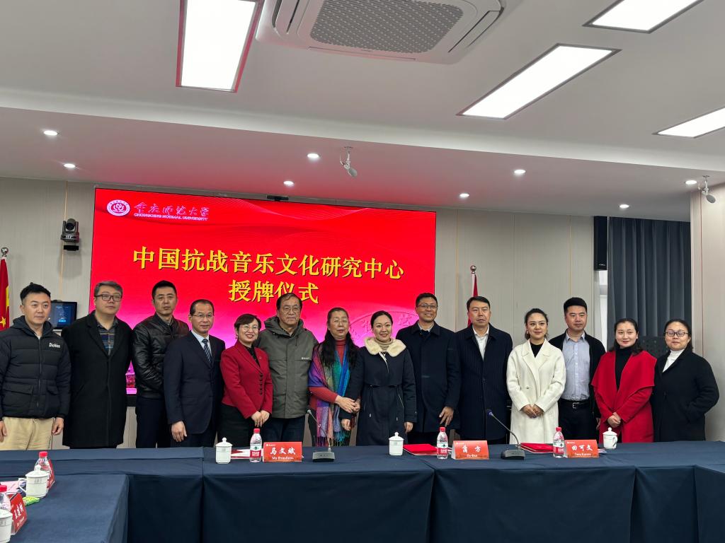 2024年1月11日,中国抗战音乐文化研究中心(以下简称“中心”)在学校正式成立并举行了授牌仪式。中央音乐学院教授、博士生导师蒲方受聘为中心学术委员会主任,武汉音乐学院教授、博士生导师田可文受聘为中心特聘专家。学校高层次引进人才、音乐学院研究员、博士生导师汤斯惟担任中心主任。来自国内外专家学者近20人参加会议。成立会议由音乐学院党委书记曾凡浏主持,科研处副处长马文斌为中心授牌。