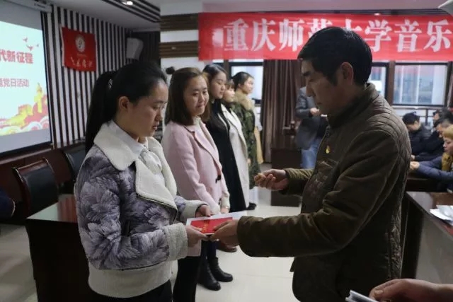 2017年11月16日音乐学院党委全体党员就曾在“青春喜迎十九大,不忘初心跟党走——音乐学院主题党团活动”中面对党旗重温入党誓词。本次主题党日活动就是在此基础上,通过薪火传承仪式,将不忘初心、牢记使命、高举旗帜、团结奋进的精神传递到每一位党员同志的心中。在仪式中,党委书记鲁福崇、老党员代表刘天学为新入党的六位党员同志佩戴党徽,颁发新党章和十九大报告。