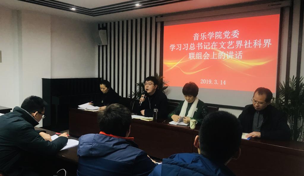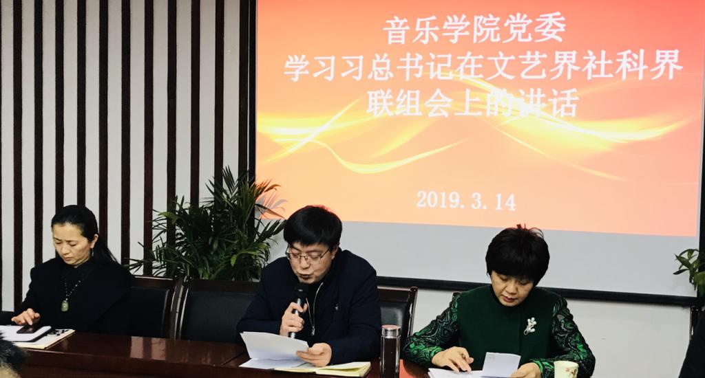2019314日下午三点,音乐学院党委组织全体教职工在音乐学院二楼会议室集中学习习近平总书记在文化艺术界、社会科学界联组会上的讲话。音乐学院党委书记鲁福崇为老师们介绍了习近平总书记的讲话内容。