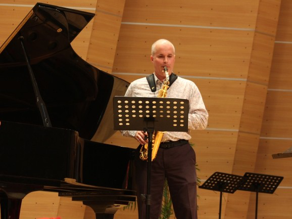 6月3日晚,“美国萨克斯管演奏家詹姆斯·罗曼教授独奏音乐会”在重庆师范大学校友会堂音乐厅如期举行。除音乐学院的领导、老师和同学以外,重庆市管乐学会和重庆市萨克斯管研究会的领导和老师也光临了此次音乐会。音乐会上,詹姆斯·罗曼教授演奏了多部萨克斯管经典作品。尤其值得一提的是华裔作曲家何建军创作的《奏鸣曲》,此曲是2003年特别为詹姆斯·罗曼创作的一首中音萨克斯管与钢琴的作品。此曲让听众领略了中国音乐元素与当代音乐创作技法在萨克斯管上的结合。