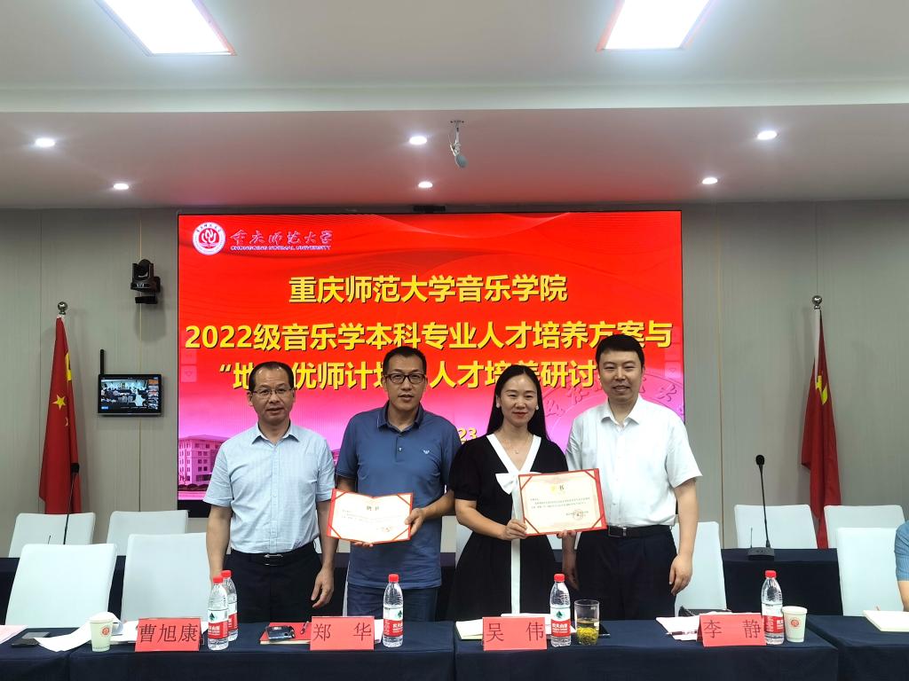 会议第三项,郑华副院长和吴伟副院长为曹旭康、李静两位受邀指导我院工作的专家颁发“PA视讯官网音乐学专业行业指导专家”聘书。