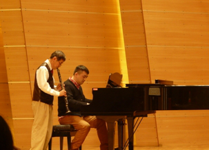 吴大轸老师首先为老师和同学们吹奏了一曲《单簧管狂想曲》,奇妙的音符伴随着吴老师灵巧的双手不断变化,一下子就吸引了同学们的注意力。接着,吴老师又和我校学生合奏了一曲《如歌的慢板》,单簧管和钢琴的完美结合让大家久久沉浸在音乐的海洋中。表演完两首曲子后,吴老师为大家开始详细讲解美国爵士的起源和对中国民族音乐的启发。爵士乐成形时间是19世纪末、20世纪初。公认的发祥地是美国南部路易斯安那州的一个亚热带城市新奥尔良。在众多流行音乐中,爵士乐是出现最早并且是在世界上影响较广的一个乐种,爵士乐实际就是美国的民间音乐。欧洲教堂音乐、美国黑人小提琴和班卓传统音乐融合非洲吟唱及美国黑人劳动号子形成了最初的"民间蓝调","拉格泰姆"和"民间蓝调"构成了早期的爵士乐。所以爵士乐其实就是美国黑人把古典音乐和西洋乐器合二为一创造出来的。吴老师认为这对我们中国的民族音乐是一个很大的启发,因为中国有大量优秀而又风格迥异的民歌,但伴随着城市化的进程,这些珍贵的资源正逐渐消失,所以我们必须好好的保护和利用。因此,吴老师提出了创建一种中国自己的即兴音乐——中国即兴音乐,其构成就是借鉴美国爵士乐和中国民歌、戏曲、流行音乐等各种元素发展出一种新的音乐形式。这一设想已经得到了美国和中国的很多音乐专家的支持,他们相信这一设想的提出必定会极大地促进中国音乐的发展。 所以,吴老师也希望在座的各位老师和同学积极投入研究,为中国音乐的发展贡献自己的力量!吴老师的讲学得到了大家阵阵掌声,大家都被他这种孜孜不倦、勇敢攀登专业高峰的精神所感动。紧接着,吴老师又现场邀请了一位同学和他一起即兴表演了一首《诙谐曲》,也得到了大家的阵阵掌声。眼看着演出结束的时间就到了,吴老师又在大家的不断要求中独奏了一曲歌剧《萨达阔》选曲,其高超的技巧让现场每个同学都惊叹不已。最后,在大家的高声欢呼和阵阵掌声中,这场美妙的音乐会结束了。但现场的每个人都久久沉浸在悦耳的音符中,不愿离去,只希望这场音乐会能够一直演奏下去……