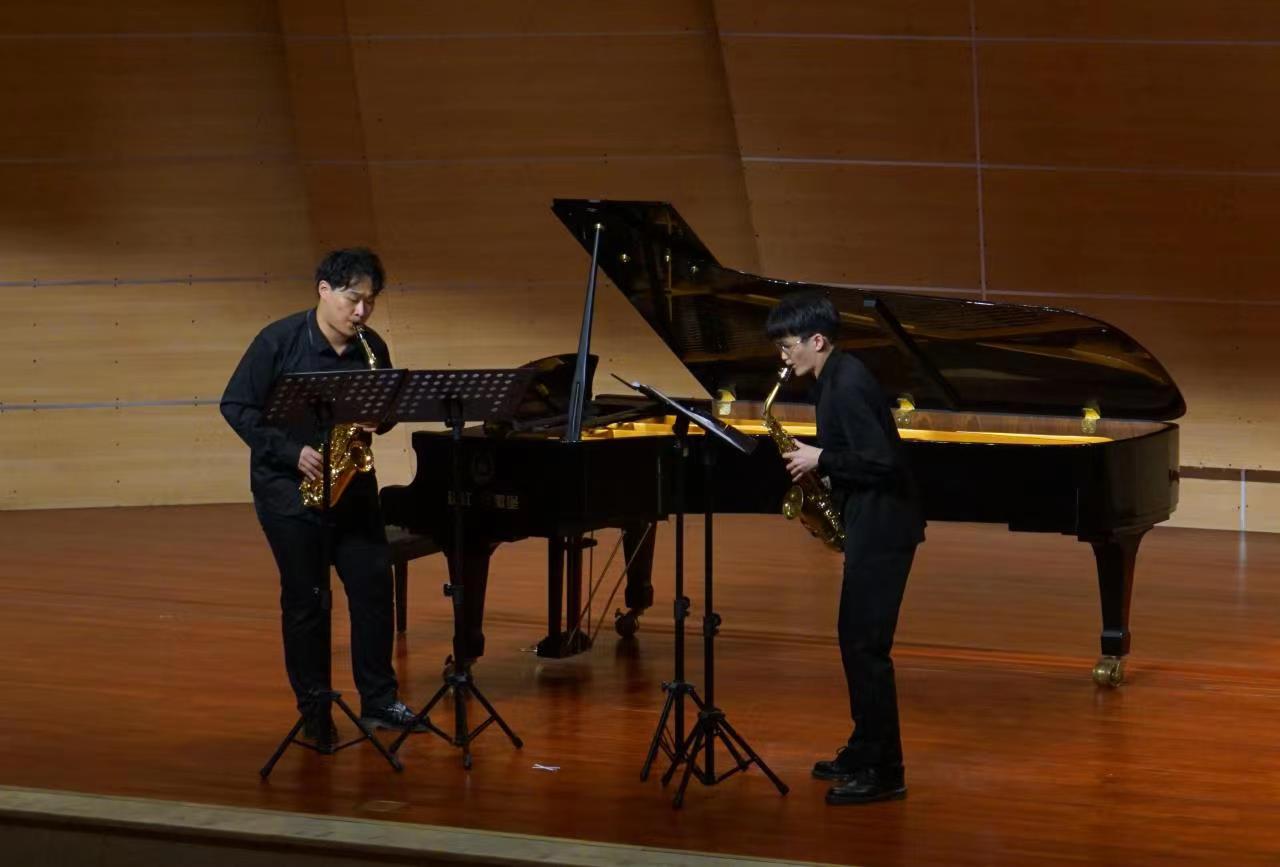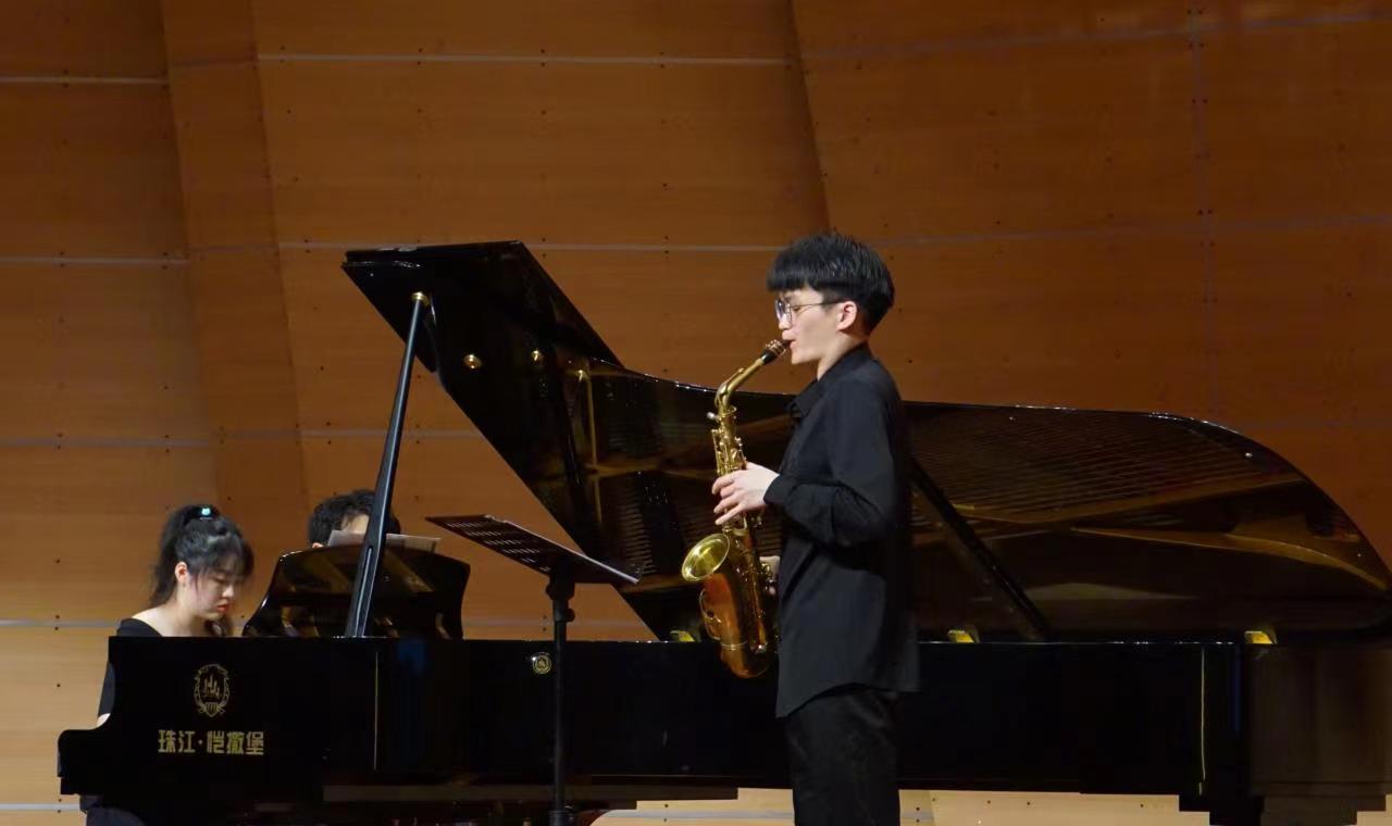 音乐会以威廉•巴赫创作的《降E调二重奏》开场,刘睿博同学和王星然同学配合默契,和声悠扬,展现了巴洛克音乐独有的秩序感和美感。随后是两首法国萨克斯独奏作品,德彪西的《狂想曲》和布特里的《嬉游曲》,刘睿博同学先后演绎了印象派和现代音乐两种截然不同的音乐风格,为观众带来了新奇的听觉体验。