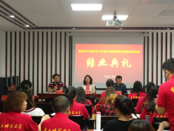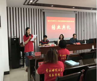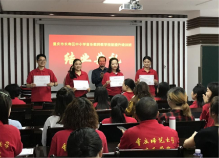 胡老师的课程结束后,稍作休息,结业典礼即将开始。长寿区教师进修学校程小亮、重庆市教育科学研究院音乐教研员胡苹、PA视讯官网副院长郑华以及全体学员和班主任老师参加典礼。结业典礼由程小亮老师主持。程老师说经过五天的培训,各位学员都能适应快节奏高强度的培训学习,无一人缺席请假,取得了非常好的培训效果,这既是对我工作的支持,也是对长寿区音乐教育发展的贡献。恭喜各位学员顺利结业。对于每一位学员来讲,他们及期盼结业典礼的召开,也害怕典礼的召开,期盼的是可以尽早回家,害怕的是意犹未尽,各小组代表上台将五天收获与感想与各位学员分享。