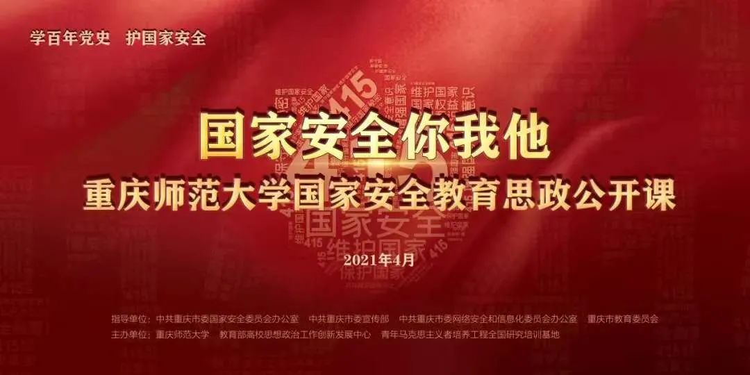2021年4月12日,由重庆市委国安办、市委宣传部、市委网信办、市教委指导,重庆师范大学、教育部高校思想政治工作创新发展中心、青年马克思主义工作者培养工程全国研究培训基地主办的《国家安全你我他》国家安全教育思政公开课在重庆师范大学校友会堂隆重举行。公开课最后,音乐学院2020级音乐学一班的全体同学登台献唱了结尾曲《我是国旗上的一颗星》。