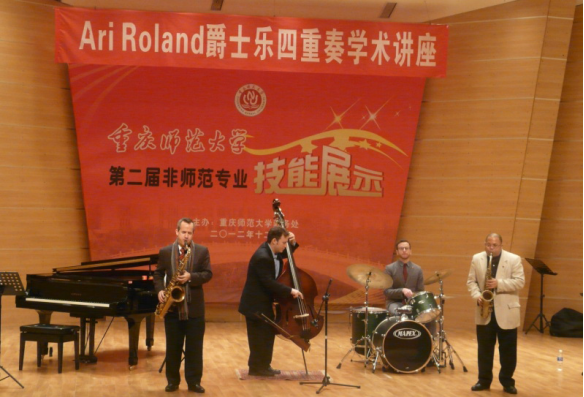 - 美国文化爵士乐章——记Ari Roland爵士乐四重奏2012年12月17日晚七点,在重庆师范大学校友会堂音乐厅,所有爱好爵士音乐的朋友汇聚一堂,等待着从美国纽约来的四位著名的爵士乐演奏家带来的精彩演出。此次学术讲座由重庆师范大学国际交流处主办。音乐厅内座无虚席,在PA视讯官网器乐系主任胡秋岩老师的介绍下,四位演奏家出场,他们的艺术家气质和绅士形象马上吸引了现场观众...