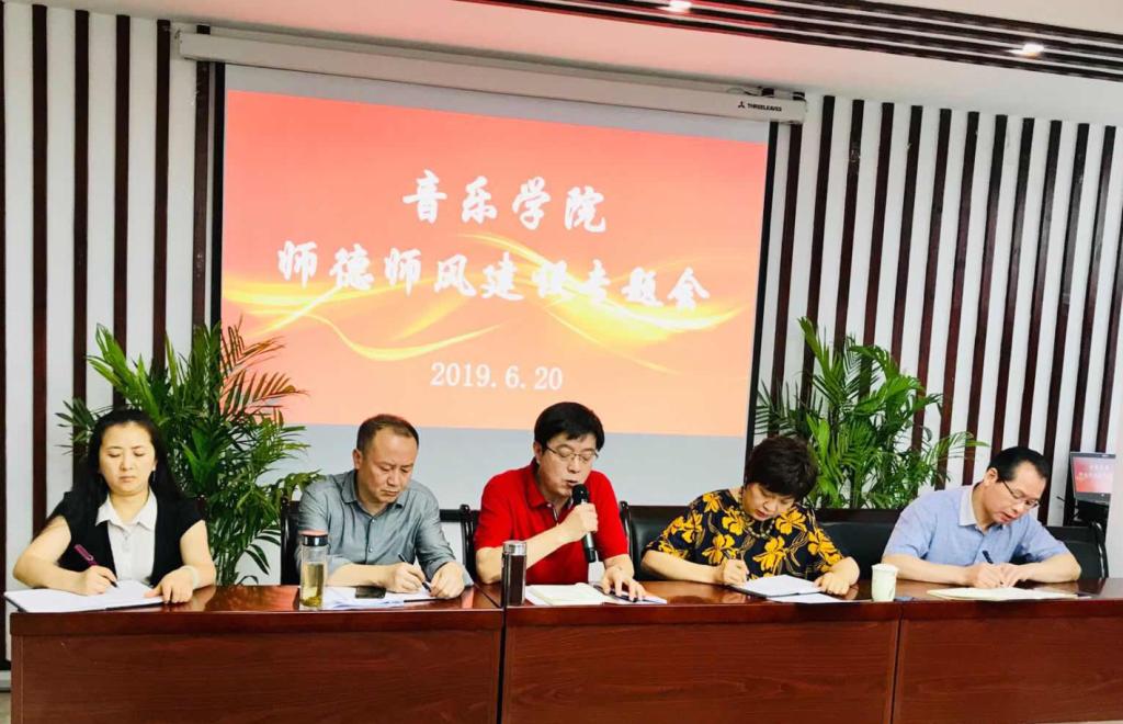 - 2019年6月20日下午,音乐学院举办师德师风专题教育活动。全院教职工参加会议,院长张礼慧主持,党委书记鲁福崇作重要讲话。鲁书记说,国无德不兴,人无德不立。习近平总书记一贯高度重视培养社会主义建设者和接班人,把立德树人作为教育的中心环节。作为高校教师要有规矩意识,应该懂得,选择当老师就选择了责任,就要尽到教书育人、立德树人的责任。高校立身之本在于立德树人。只有培养出一流人才的高校,才能够成为...
